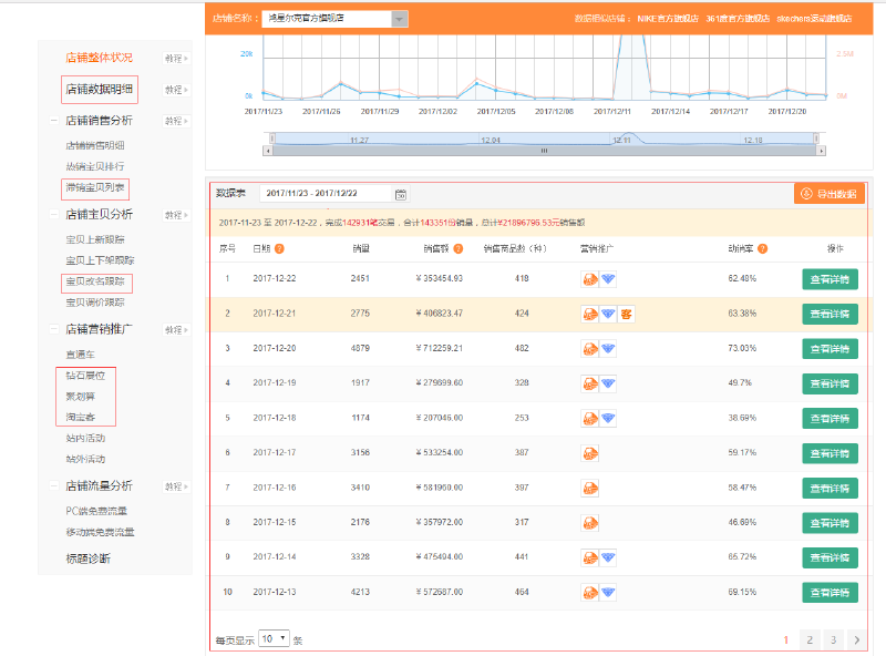 主要包含店铺的数据明细、滞销宝贝、宝贝的上新跟踪、宝贝的改名记录、钻石展位、聚划算、淘宝客。